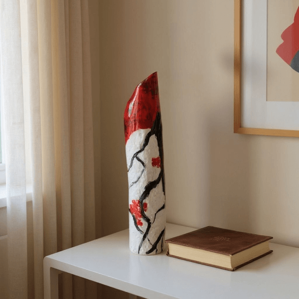 30 cm boyundaki kiraz çiçekleri desenli seramik vazo, tamamen el işçiliğiyle şekillendirilmiş ve özel olarak dekore edilmiştir. Kırmızı, beyaz ve siyahın uyumlu birleşimi, yaşam alanlarınıza sofistikebir atmosfer katar. Modern ve minimalist dekorasyonlar için ideal olan bu parça, salon, ofis veya antre gibi alanlarda zarif bir detay olarak öne çıkar. Serinin diğerürünleri arasında daha kısa ve geniş formlu vazolar, farklı renk temaları ve tamamlayıcı seramik objeler de yer almaktadır. Evinize el yapımı sanat dokunuşu katmak ve iz bırakacak hediyeler için koleksiyonu keşfedin.