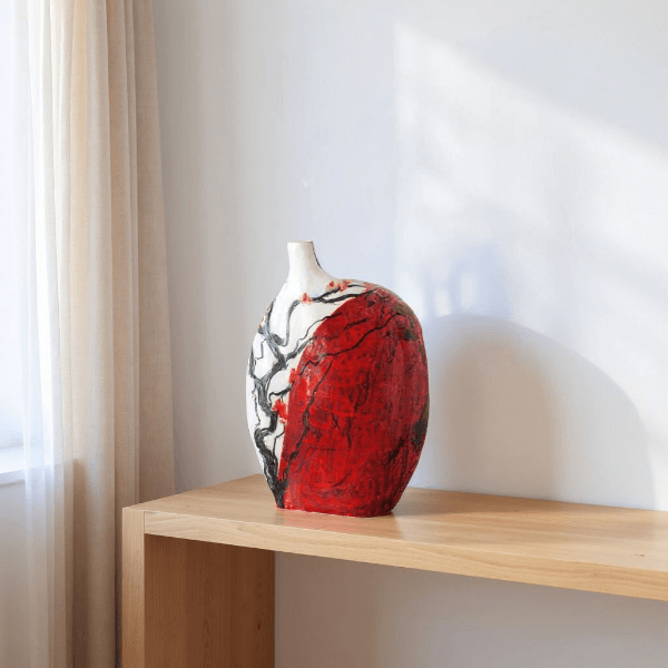 Kiraz çiçeklerinden ilham alınarak tasarlanan bu özel el yapımı seramik vazo, 31 cm boyu ve modern estetik dokusuyla yaşam alanlarınıza zarif bir dokunuş katar. Her aşaması özenle elde şekillendirilmiş ve dekorlanmıştır. Kırmızı, beyaz ve siyah tonlarının uyumuyla dikkat çeken bu dekoratif vazo; salon, ofis, oturma odası veya giriş alanlarında şık bir dekor objesi olarak kullanılabilir. Uzun ömürlü yapısı sayesinde hem klasik hem de modern iç mekanlara mükemmel uyum sağlar.