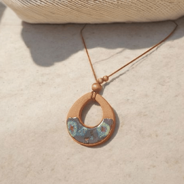 Doğallığın ve zarafetin birleştiği bu el yapımı seramik kolye, minimalist tarzı sevenler için özel olarak tasarlanmıştır. Yaklaşık 7 cm boyutunda olan kolye, her aşaması elde şekillendirilip özenle dekorlanmıştır. Modern tasarımı sayesinde günlük kombinlerinize şıklık katar, aynı zamanda özgün bir aksesuar olarak tarzınızı tamamlar.